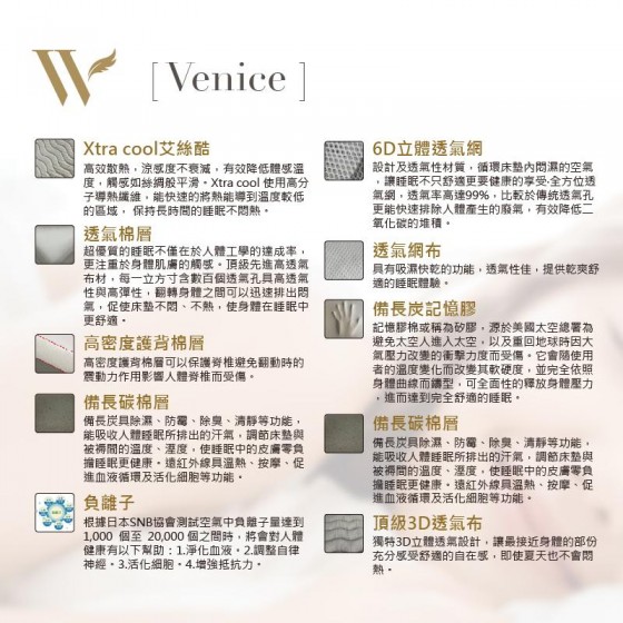 45%涼感 ❘ 抗菌 ❘ 防螨 ❘ 透氣 ❘ 恆溫釋壓 ▪ 床墊厚度 34 cm ▪ 軟硬度 ●●●●○○○ 等級④ ▪ 支撐與綿軟的躺感 ▪ Xtra cool 艾斯酷涼感紗 尺寸規格 / 單位 (尺)