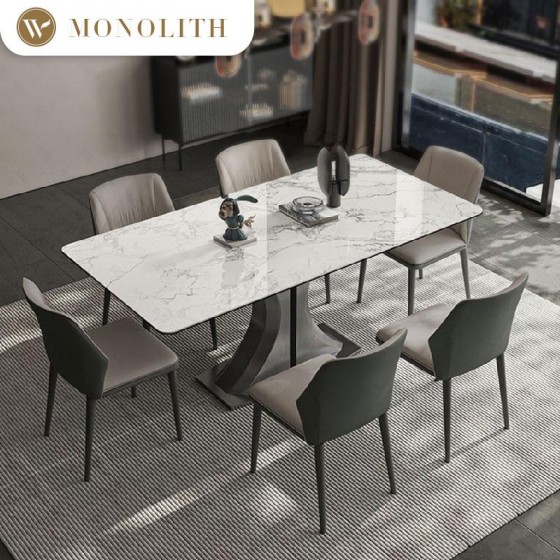 「Monolith 磐石西餐桌」桌板選用啞光質地的雪花白岩板,岩板特性耐高溫、耐刮磨、面板不吃色、易清潔。霧面塗層處理更增加觸感舒適度,手感滑順柔和。同時注重細節和質感,可以是與家人放鬆、凝聚溫馨的日常所在;也可以是款待客人品嘗家常菜的舒適會談空間。