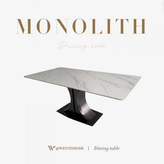 「Monolith 磐石西餐桌」襯線體般的T字型中心桌柱支撐岩桌板,
